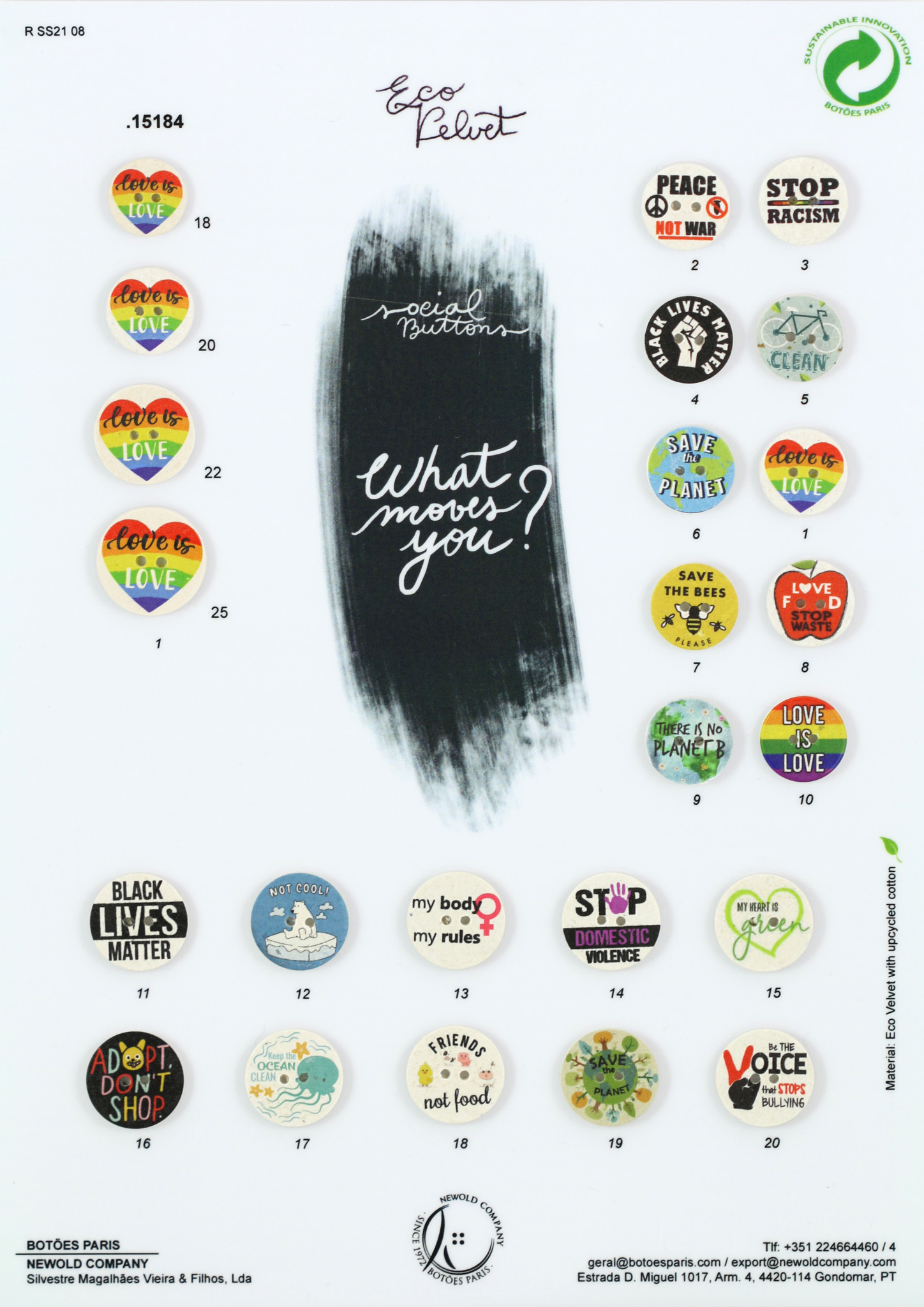 Knapparna är tillverkade av: 20% återvunnen bomullsfiber, 20% Ecovelvet återvunnet avfall, Polyester, mjukgötare och färg